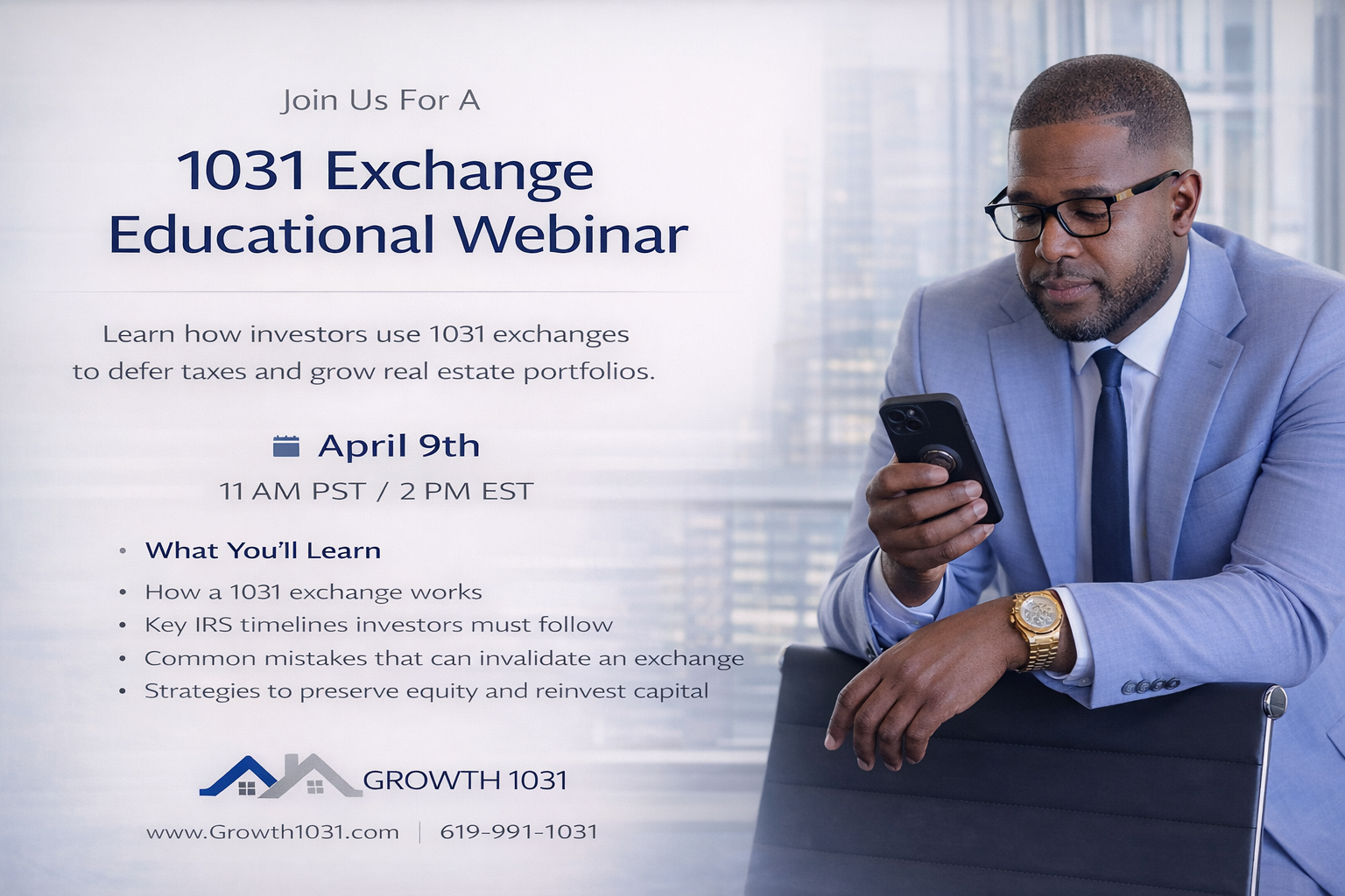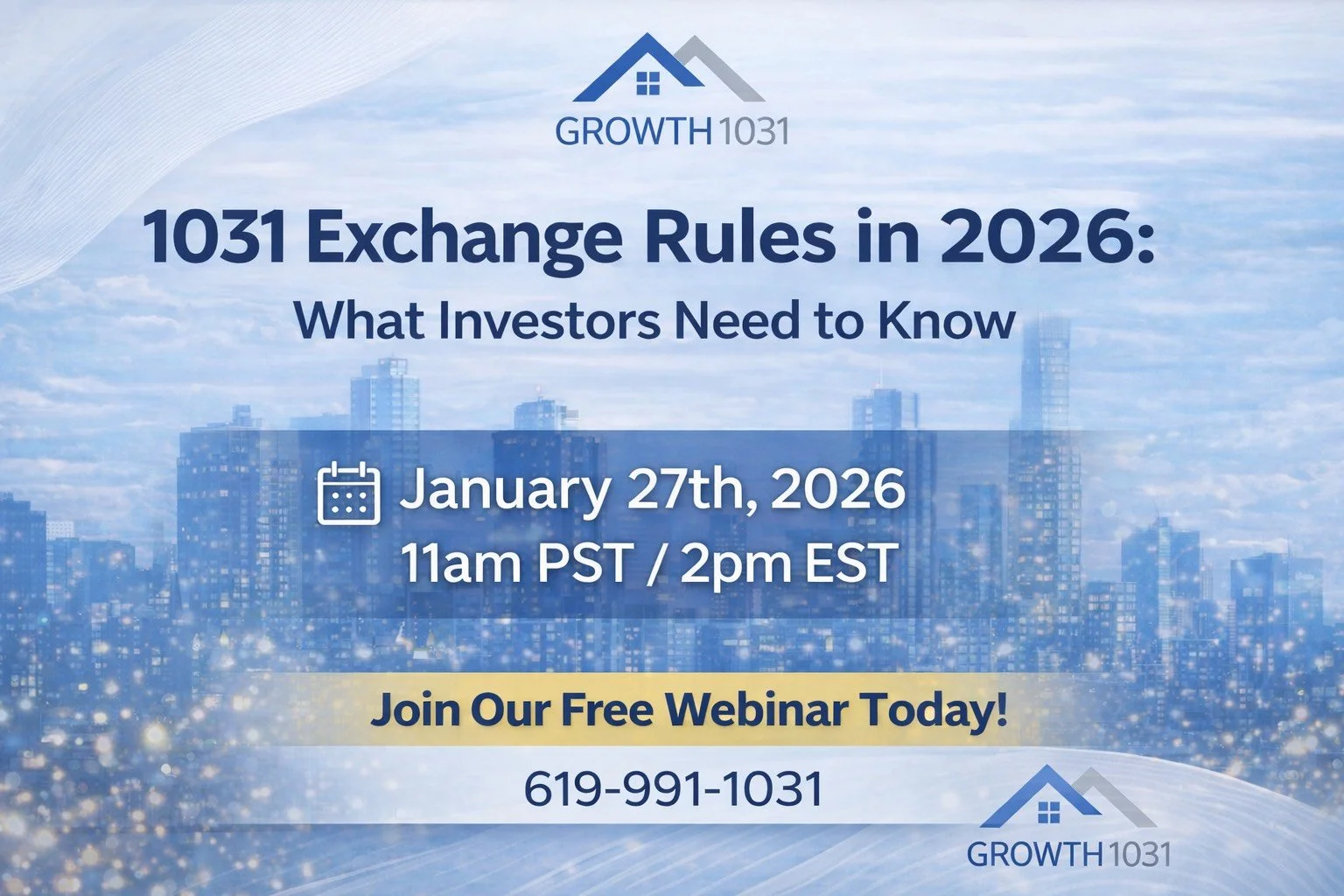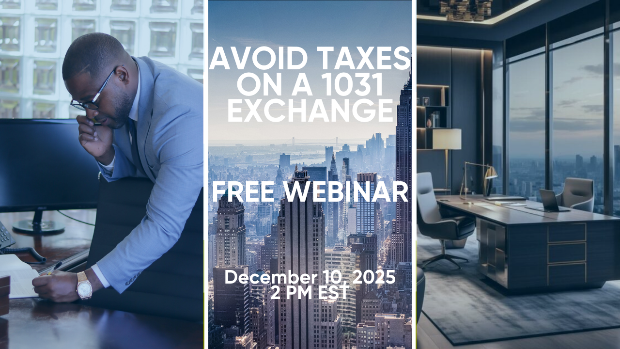 Join our free 1031 exchange webinar to learn the benefits, process, and strategies for maximizing real estate investments. We'll cover tax-deferral advantages, common pitfalls, and practical tips to help you navigate the 1031 exchange process. Whether you're a seasoned investor or new to 1031 exchanges, this session will provide valuable insights and answers to your questions.